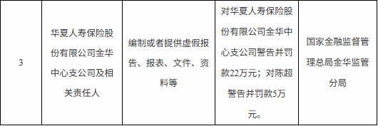 国家金融监督管理总局金华监管分局对华夏人寿保险股份有限公司金华中心支公司警告并罚款22万元;对陈超警告并罚款5万元。